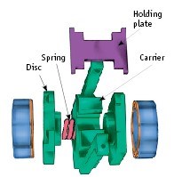 如果您还记得,在平行滑动设计中(图 5),两个圆盘通过弹簧在保持架中分开。该弹簧允许圆盘有足够的行程以超过热膨胀的影响。