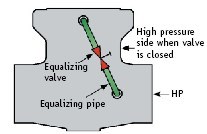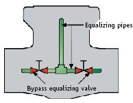 - 使用一个或多个旁通阀以及连接阀门中心腔和旁通管的平衡管进行旁通。根据旁通阀的数量和配置,可以保持双向密封(图 6)。