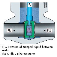 压力锁定(图 7)发生在双座阀中,其中阀座上游、下游或两侧的管线压力下降(作为工厂运行或事故的函数),从而产生足够的压差以阻止打开阀门。