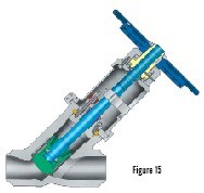 压力密封截止阀用于可能需要某种程度的流量控制(或节流)的应用(例如,在工厂启动或关闭模式下)。它们非常适合发电厂的隔离应用(例如,主蒸汽隔离、给水加热器隔离、锅炉/省煤器隔离等)。压力密封球可以采用与其对应闸阀相同的材料类型、驱动品种(手动、齿轮驱动、电动、气动、电动液压等)、阀内件组合和材料以及 ASME 压力等级。它们可以垂直(图 14)或倾斜(Y 型)方向(图 15)提供,作为所需流量 (Cv) 的函数。压力密封球可以与机械固定在阀杆上的圆盘一起提供,这样,当处于打开位置时,可以自由流动。然而,它们也可能配备在阀瓣袋中自由浮动的阀杆(参见插图,图 15)。在此方向(停止/止回)中,当阀门处于打开位置时,发生反向流动时阀盘将关闭,从而除了基本停止(或隔离)功能外还提供止回阀功能。