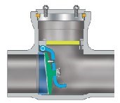 2. 倾斜盘检查(图 18)。由于铰链销和阀瓣中心线之间的力矩较短(与摆动止回阀相比),倾斜阀瓣止回阀可以更快地对流量反转做出反应,从而为上游设备和介质“锤击”潜力提供更高的安全边际。购买前请注意这两种常见类型的止回阀在成本和 Cv 方面的差异。